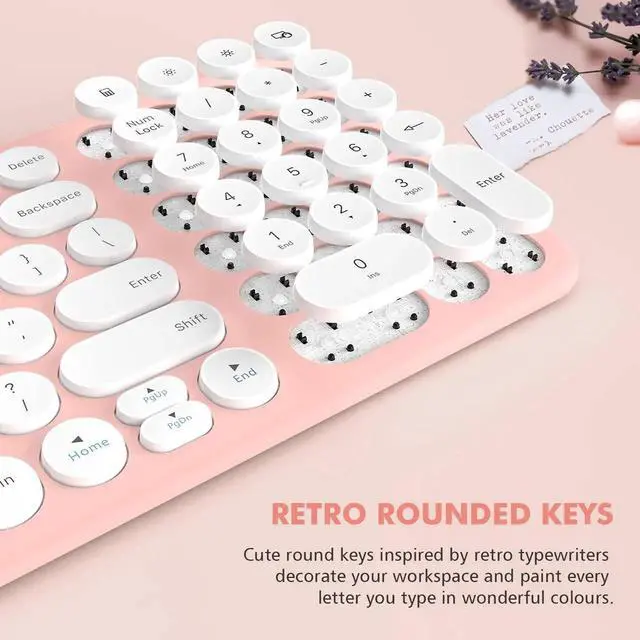 RETRO ROUND KEYBOARD DESIGNVintage typewriter-inspired rounded keycaps offer you visual enjoyment and please you with every single press & click. The ergonomic slope design of the pink keyboard gives you the most comfortable typing experience.