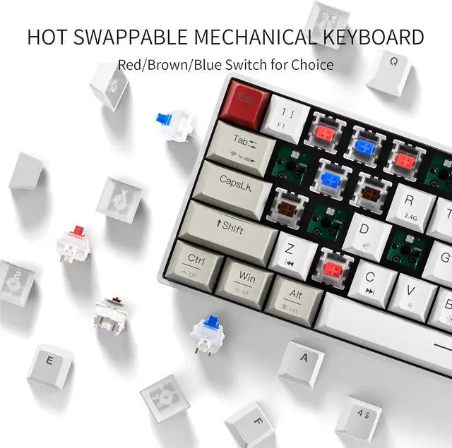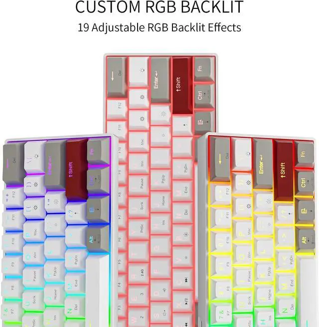 [Double Shot Keycaps & Hot-swappable] The two-color injection keycaps of this wireless mechanical gaming keyboard provide clear and uniform backlighting that never fades. And hot swappable function can let you customize your mechanical keyboard with different combination layout on keycaps and 3-pin switches (Outemu).