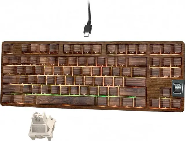 Wired Mechanical keyboardThe Womier F87 mechanical keyboard only supports Type-C connection. It uses water transfer technology to print the walnut pattern on the ABS keyboard shell, and adds a glossy oil protective film, the pattern is clear, bright color is not easy to fall off. The bottom case and top cover of the F87 keyboard are made of ABS, not walnut wood. The keyboard is just a walnut texture theme. Thank you for your support.