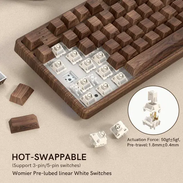 Linear switch & Hot-Swappable Custom KeyboardThis custom mechanical keyboard base is hot-swappable and supports 3-pin or 5-pin switch replacement. Even keyboard beginners can easily DIY their own keyboard. The WomierF87 mechanical keyboard is equipped with a pre-lubricated linear axis switch for smooth typing and pleasant mechanical sound, providing fast response for your games.