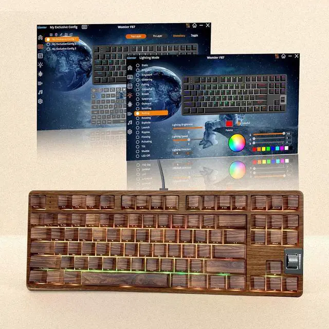 RGB Backlit Keyboard The Womier F87 keyboard is equipped with stunning RGB lighting effects, and RGB light bits are also added to the sides of the keyboard. The keyboard has 19 preset lighting effects that add a great atmosphere to the game. And support cool music rhythm lighting effects and drivers. Lighting brightness and lighting effect can be adjusted by FN+ key combination. You can choose the lighting effect according to your needs. You can turn off the backlight if you don' t need it.