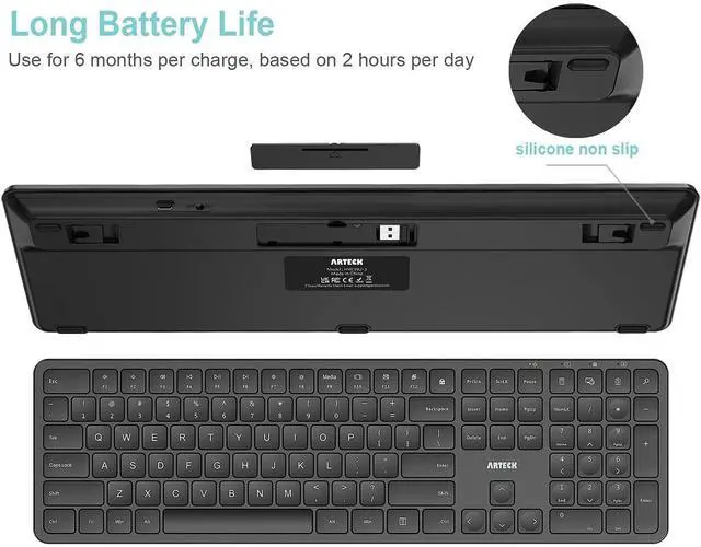 Package contents: Arteck Full Size 2.4G USB Wireless Keyboard, nano USB receiver, USB-C charging cable, welcome guide, our 24-month warranty and friendly customer service.