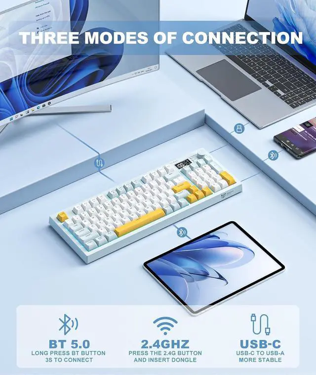 Tri-Mode Wireless KeyboardThis versatile wireless keyboard supports three connection methods: reliable Bluetooth 5.0, high-performance 2.4GH z wireless with 1000Hz polling rate, and wired USB-C mode. Enjoy seamless switching across all your devices.