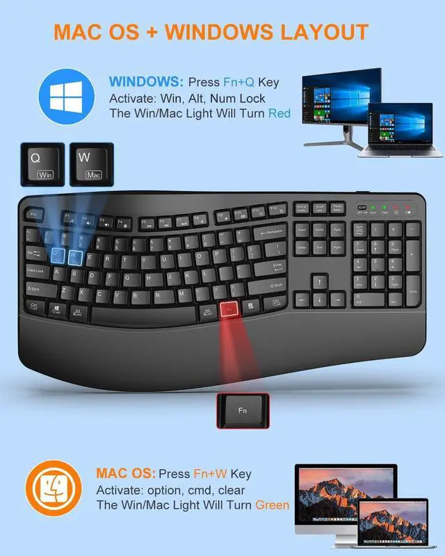 - This curved keyboard comes with a dual system layout for Mac and Windows. Switching between Mac and Windows systems is as easy as a single touch. This computer keyboard works well with computer, laptop, Chromebook, PC, desktops, TV, Windows, Linux, Chrome OS, Mac OS.