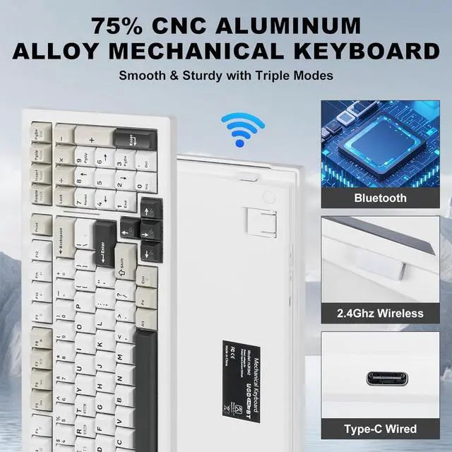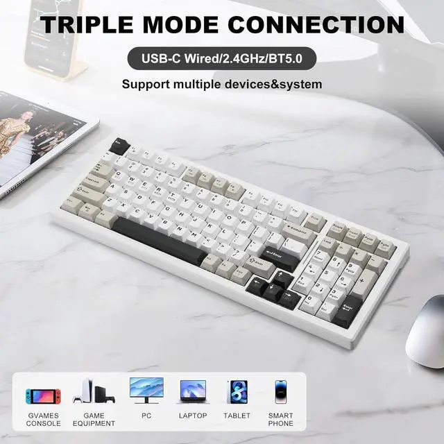 Tri-Mode & Seamless Switching Tri-Mode BT 5.0 / 2.4GH z/USB-C Wireless Mechanical Keyboard Connect up to 5 devices simultaneously via Bluetooth, 2.4GH z dongle, or USB-C wired mode. Instantly switch between devices (PC/Mac/Phone/Tablet) with FN+ shortcut keys, ideal for multitasking across work, gaming, and study.