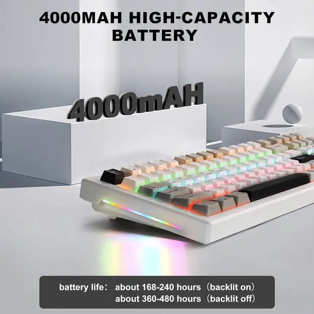 4000mAh Long-Lasting Battery & PBT Durability Week-Long Wireless Freedom 4000mAh battery delivers 200+ hours of backlit runtime (USB-C rechargeable). Double-shot PBT keycaps resist shine and fading, ensuring legends stay crisp through years of heavy use.