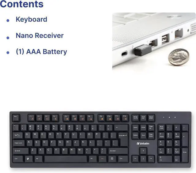 Contents: Keyboard, nano receiver, 1 x AAA battery
