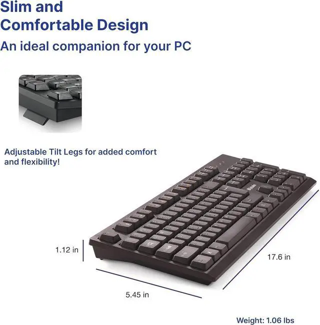 Hot keys provide instant access to media controls; adjustable tilt legs for added comfort and flexibility