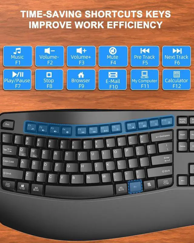 ERGONOMIC WAVE DESIGN, ALL-DAY COMFORTThis wireless ergonomic keyboard with innovative wave design, based on feedback from RSI (Repetitive Strain Injury) patients, effectively reduces muscle tension and increases comfort. The gracefully arched, wave-shaped key layout invites your hands into a natural, ergonomic position, allowing you to type with ease while maintaining a healthy arm angle. It minimizes strain on hands, wrists, and shoulders. It stands as an ideal gift to convey your affection and care for loved ones.