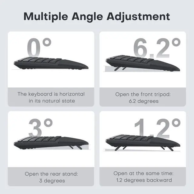 More Palm Support: Padded palm rests with soft memory foam support your wrists all day long. The ergonomic keyboard has 4 foldable feet that can be tilted as desired