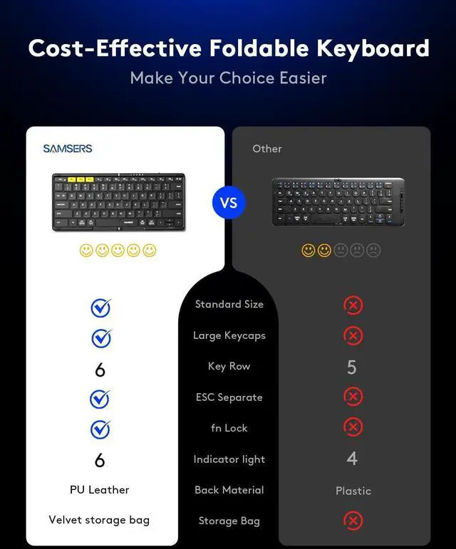 Real Full-size Folding KeyboardDesigned with 6-row of keys and 0.65 inch laptop-like standard keys, more in line with finger size and typing habits. Samsers travel keyboard must be your ideal companion for on-the-go users who seek functionality without additional bulk. Just take it to type your inspirations with total freedom!