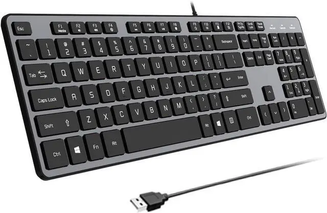 Full Size Silent Wired Flat Thin KeyboardB. Friend silent wired keyboard is equipped with 105 upgraded scissor-switch keys, offering 90% noise reduction, durability up to 3 million keystrokes. The 2mm key travel and moderate rebound ensure comfortable typing. The high-end mela technology of matte UV-coated key caps makes the keyboard look more beautiful, easier to clean and have a better touch feel