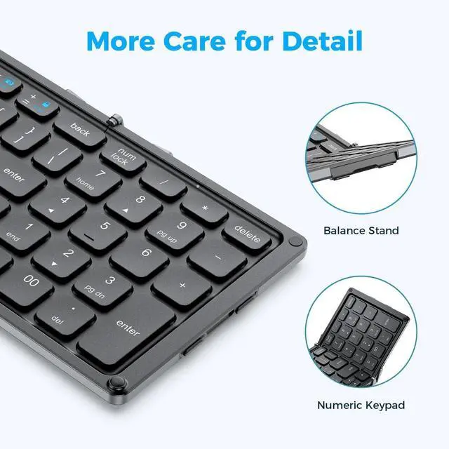 Friendly Reminder: IC-BK09 is a 82-key foldable keyboard with number pad for phones and tablets; Bluetooth only (no USB receiver, no wired mode); 15 mm key pitch are smaller than laptop size; keys are non-backlit and the board is not spill-proof, so fold and store gently.
