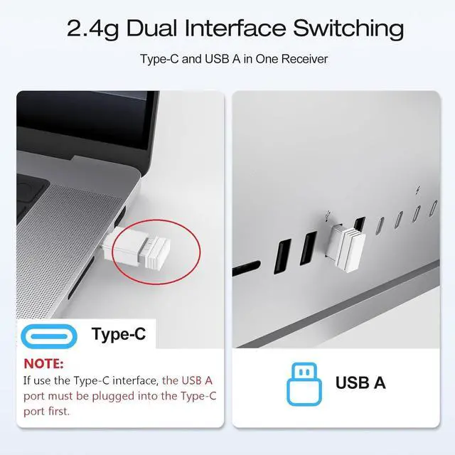 2.4G Receiver Dual Interface: Type-C interface and USB A interface for you to choose, easy plug and play, compatible with All Mac devices!!!