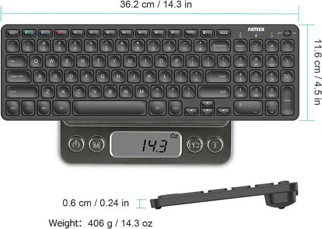 Thin and Light: Compact size ( 14.3 X 4.5 X 0.24 in) and light weight ( 14.3 oz) but provides full size keys, shortcuts for comfortable typing.
