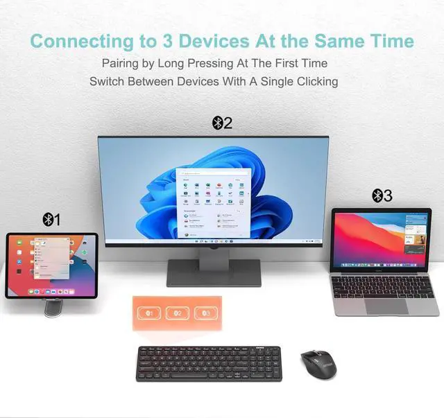 A Single Clicking: This keyboard is able to connect to 3 devices at the same time. You can switch between 3 devices with a single key clicking.