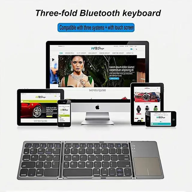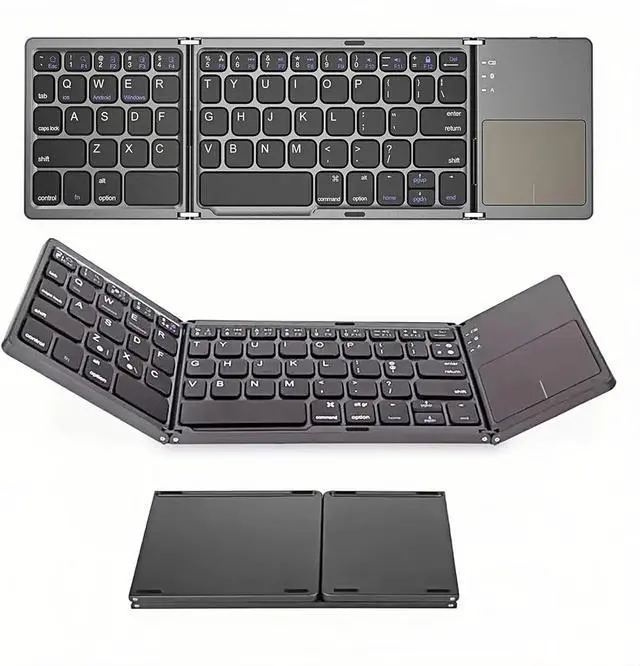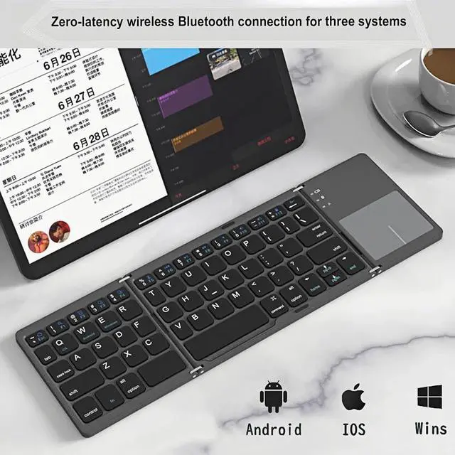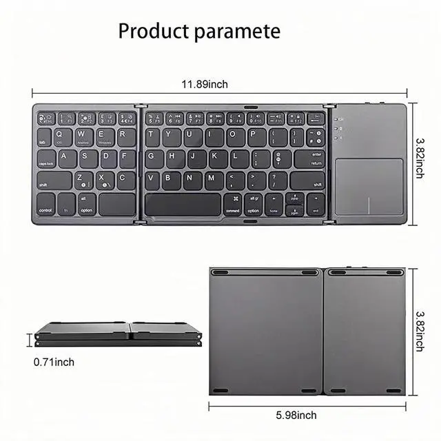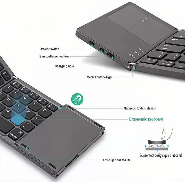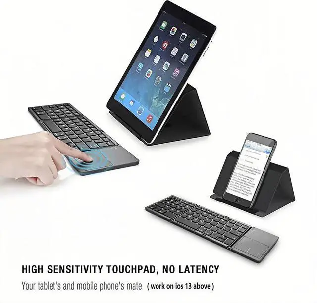 Multi-touch Trackpad Bluetooth Foldable Keyboardthin design of the portable folding keyboard allows you to fold it up and put it in your pocket or bag without taking up too much spaceStable bluetooth connection with max working distance of 10 meters. You can use it anywhere when you need to finish some type work on your phone or tablet, Near-standard size design provides accurate, fast typing, just like the desktop keyboard you are used to. Quiet keys allow you to focus on your work. Perfect gift for travel and business trips!