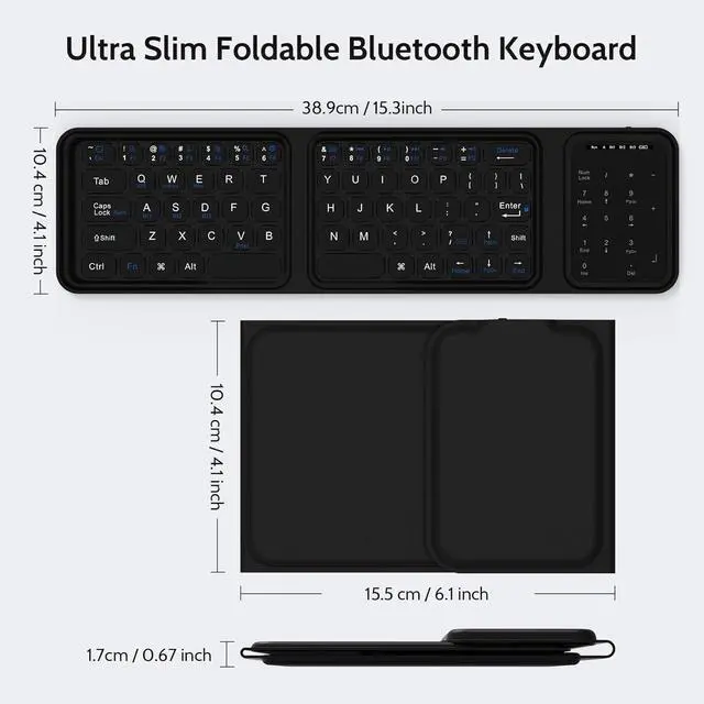 Folding Bluetooth Wireless Keyboard This portable bluetooth keyboard with trackpad and number keypad (Dimensions: 15.3 x 4.1 inch ). Standard size design provides accurate, fast typing, just like the desktop keyboard you are used to. Quiet keys also allow you to focus on your work.