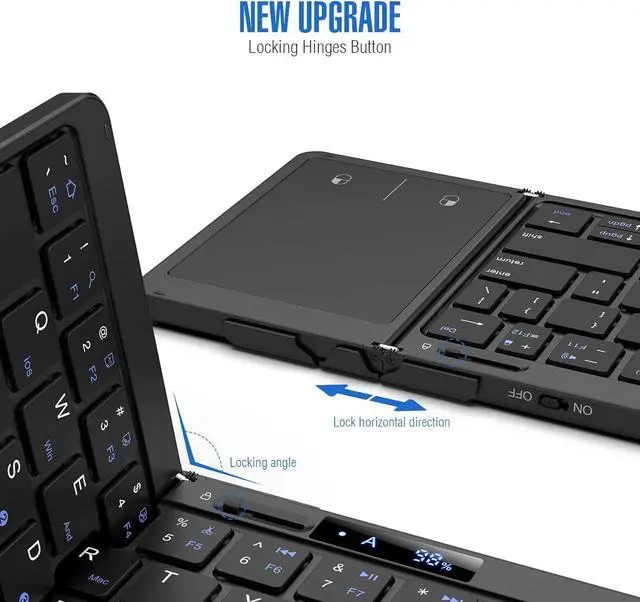 Folding Keyboard with Locking HingeCompared with the normal folding keyboard, we upgraded the design of locking hinge to ensure that the keyboard is secured by one key when typing on the desktop or on your lap, making it more comfortable and convenient for you to use.
