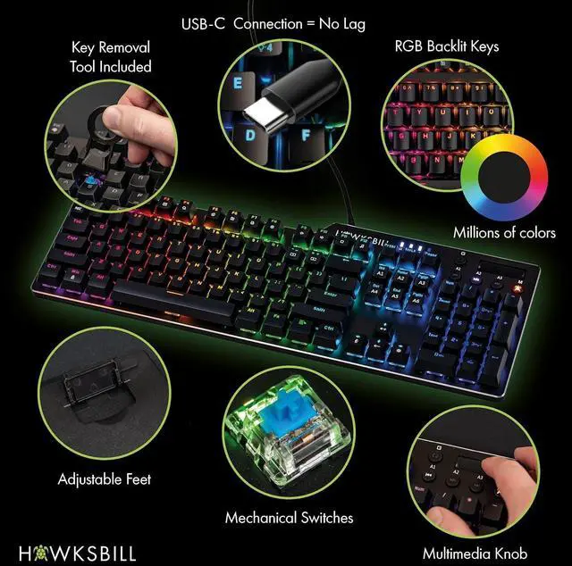 COMFORT & DURABILITY: Full-sized keyboard designed for gaming and for productivity. Built for gamers of all levels with durable construction and cleans up easily from dirt & grime. Adjustable feet let you set your keyboard to an ideal position for long gaming sessions.