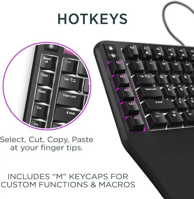 For Work and Play Features programmable Hotkeys, a USB Pass-Through port, and extra " M" keycaps. Whether writing emails, coding, or gaming, the ErgoTKL helps you do it with more comfort & efficiency.