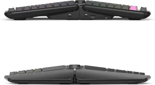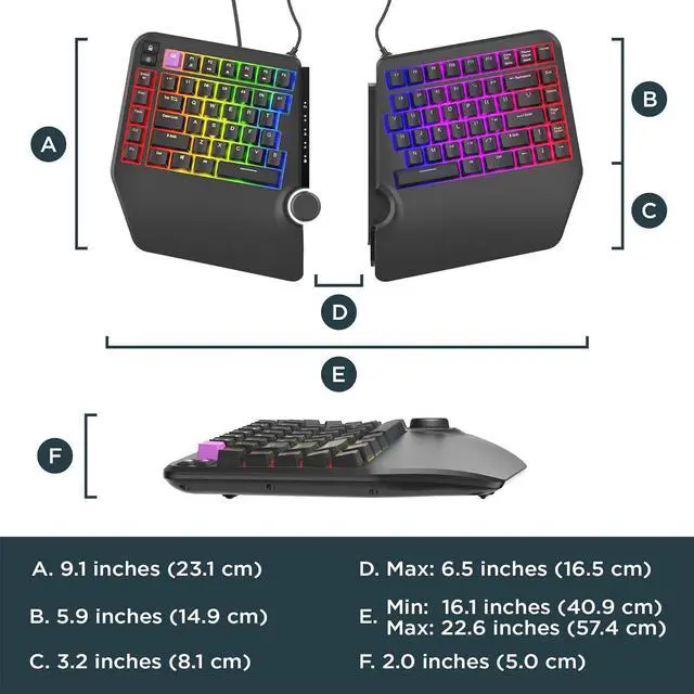 Split Keyboard Design Separates Up To 6.5 Inches ( 16.5 cm) to help eliminate wrist and shoulder pain while you type. Keeps hands and arms properly separated and helps provide pain-free typing for 8+ hours a day.