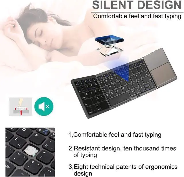 Foldable Keyboard with Super Thin and Ingenuity DesignFoldable Keyboard with Aircraft-Grade aluminum case, it is durable and scratch prevention. The ingenuity design, smooth touch and delicate look makes it a perfect match for your tablet, smart phone and laptop. The lightweight and palm-sized keyboard can be folded up and carried around even in your pocket.
