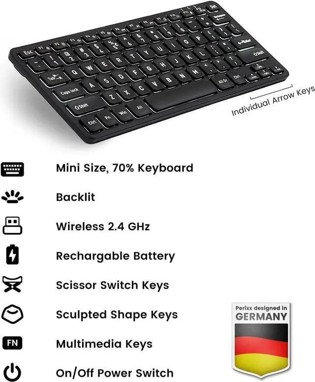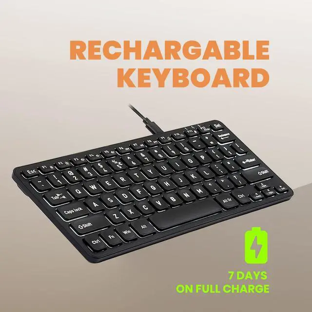 WIRELESS MINI KEYBOARD: A wireless keyboard with 2.4 GHz connectivity; A compact layout and a modern keyboard with ultra-thin profile; Bold and large font with white backlighting;