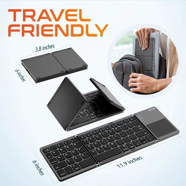 Gesture Support: Say goodbye to carrying a separate mouse. Our Delton F75 bluetooth keyboard boasts a sensitive touchpad with full gesture functions. This folding bluetooth keyboard enables a seamless, intuitive navigation experience. With its smartly integrated left and right-click buttons, this foldable bluetooth keyboard turns any space into a fully functional workspace, freeing you from the constraints of traditional setups.