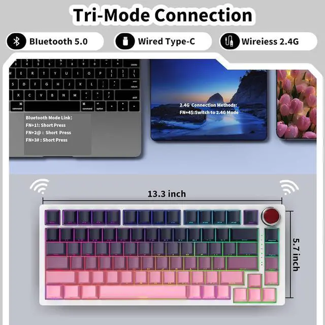 Multi-Device &Triple Mode ConnectionBOYI YK82 adopts 2.4G, Bluetooth 5.0 and Type-c wired tri-mode connection technology which make the user experience upgraded to another level in all fields. You can easily switch between 3 different wireless devices, no longer limit the connection possibilities. The 4000mAh bulit-in long life battery don' t worry games and office work!