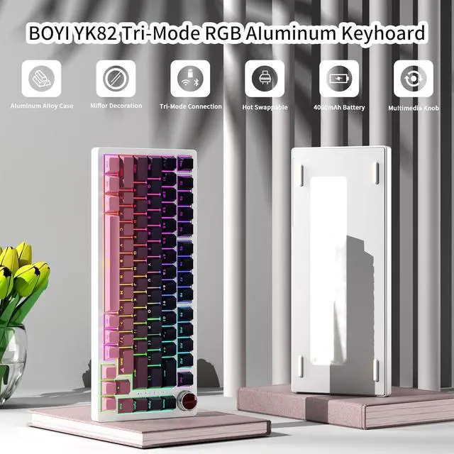 Mode-Switching&Enhanced Control KnobQuickly Adjust Volume/lighting. The BOYI YK82 Aluminum keyboard With Multi-function knob allows for smooth transitions between work and gaming modes. Offering a constant RGB glow for a focused work environment and dynamic RGB flashing for an immersive gaming experience. It also provides refined control over volume and lighting, makes the keyboard more diverse, colourful and beautiful!