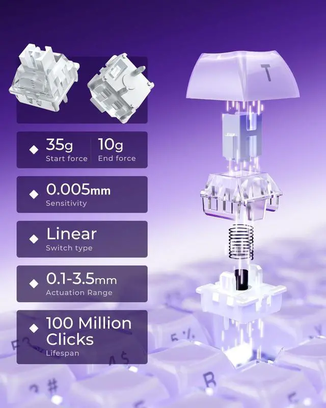 Hall Effect Magnetic Switches for Precision Control -- Advanced Hall Effect technology provides lightning-fast 0.005 mm sensitivity and adjustable actuation points ( 0.13. 6mm), giving you full control over every keystroke.