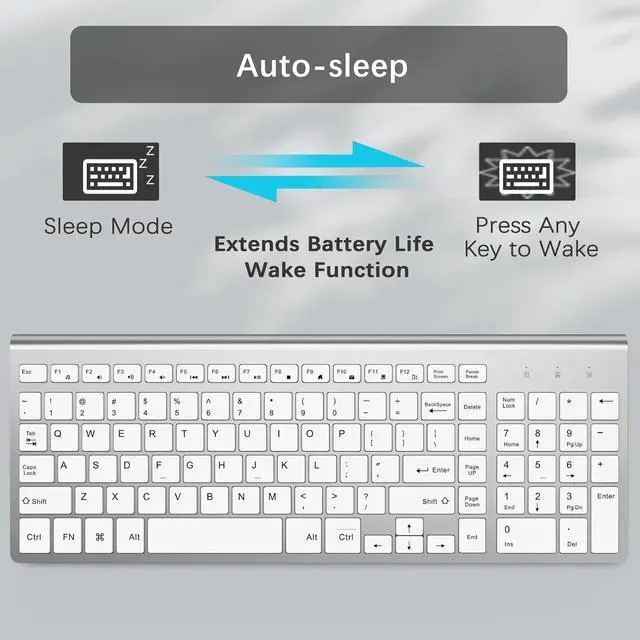 Long Standby Time-The compact keyboard enters sleep state after 8 minutes without typing, and the keyboard can be activated by clicking any key at will. For normal office use, it can work for more than 90 days. The keyboard requires 2pcs AA batteries, not included in the product package.