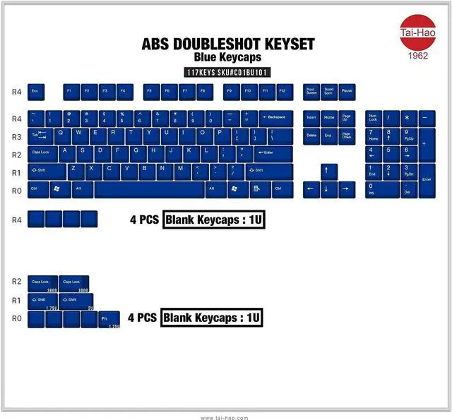 Keys: ANSI 104keys + 4 x R0 Blank Keys+ 4 x R4 Blank keys+ 1.25 Fn key + 1.75 Shift key +2U shift key+CapsLock-3000 + CapsLock-3800
