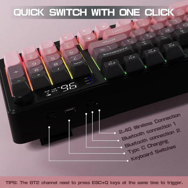 Wireless Dual Mode Connection90% Wireless Gaming Keyboard - Features stable Bluetooth 5.0 / 3.0, hassle-free 2.4G hz receiver connection. Up to three devices can be connected at the same time and switched easily, elevating user experience in various fields to another level.