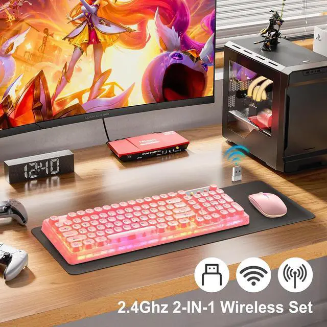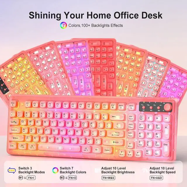 Transparent keyboard with shining keycaps The wireless transparent keyboard is made of special ABS material, modern 99 transparent keycaps will cause a typical reflection and increase the effect of the keyboard glowing, you can feel the beautiful light more clearly, make your keyboard be unique in your office. The cute keyboard with square keycaps provide a larger typing surface to help get a better and more clear typing experience.