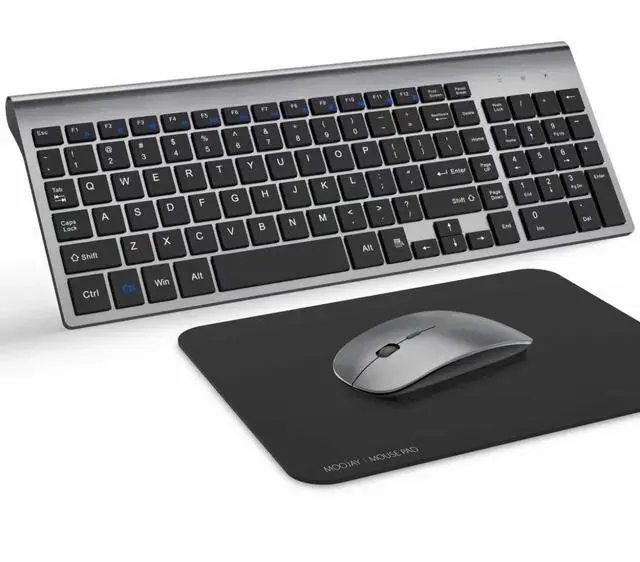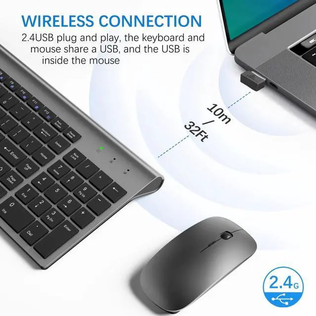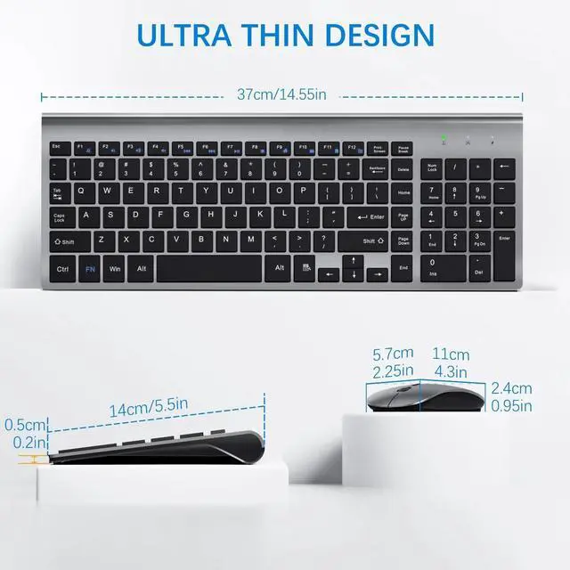 Plug&Play and Sleek Design --The keyboard and mouse set commonly use one nano receiver only for saving USB port of your computer or laptop. *The nano receiver is snapped in the storage of mouse near battery compartment. wireless desktop keyboard has all keys in scissor-cross low profile structure; which maks it ulra-slim (keystroke travel 2mm), resposive and soft. Keyboard size is 14.5 * 5.6 * 0.8.