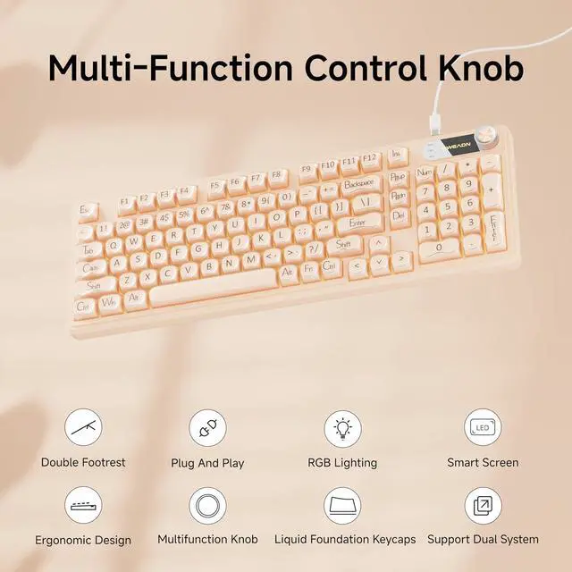 Dedicated Knob & Display Screen: Equipped with a smart rotary knob, this wired membrane keyboard allows effortless control: toggle between backlight modes with a single press, adjust brightness by rotating the knob, or hold FN + knob to switch to multimedia mode for volume control and mute. The built-in display shows the EWEADN logo and real-time status like Caps Lock, Num Lock, and Win Lockkeeping you informed without any software