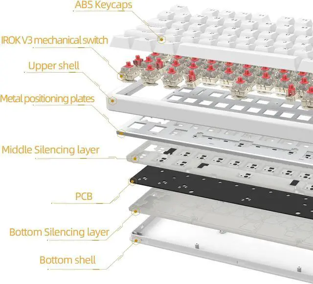Comfortable Ergonomic Stepped Keycaps- Thick ABS keycaps provide better keystrokes, while the ergonomic stepped keycaps and two-part support feet provide a comfortable typing experience. In order to maintain the overall aesthetics of the keyboard, the keycaps of all keyboard models except the black and white solid color keyboards are made of ABS opaque keycaps, which are both aesthetically pleasing and do not interfere with the normal use of the keyboard.
