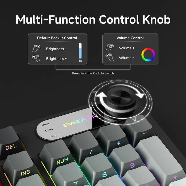 Dedicated Knob & Display Screen: Equipped with a smart rotary knob, this wired membrane keyboard allows effortless control: toggle between backlight modes with a single press, adjust brightness by rotating the knob, or hold FN + knob to switch to multimedia mode for volume control and mute. The built-in display shows the EWEADN logo and real-time status like Caps Lock, Num Lock, and Win Lockkeeping you informed without any software