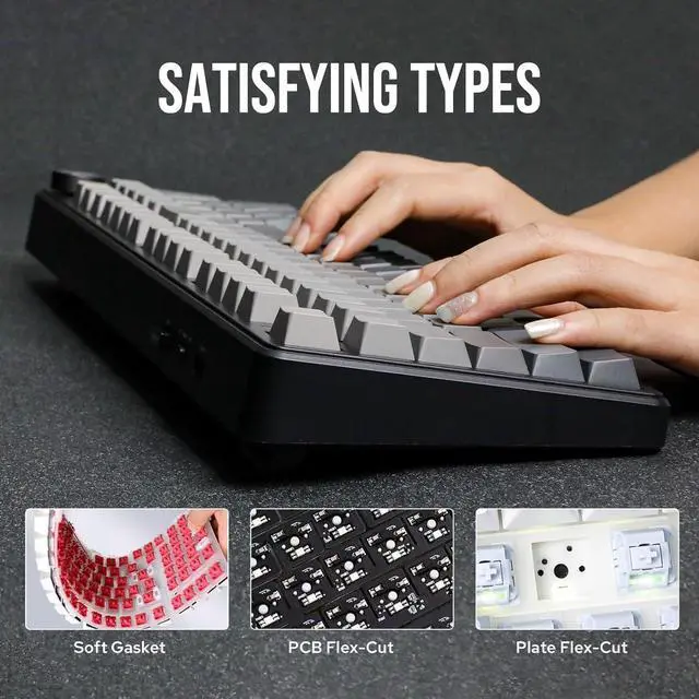 Gasket Structure&Five Layers of Sound-Improving Materials: The F99 PRO mechanical keyboard adopts a gasket structure, extended integrated silicone pad, and PCB flex-cut to optimize elasticity and stability, providing a softer and more elastic typing experience. Equipped with 5 layers of sound-dampening materials, it enhances the acoustic effect of typing. The combination of sandwich foam, IXPE switch pad, PET sound-improving film, bottom foam, and silicone shell pad helps eliminate echo and provides stable and comfortable typing sound