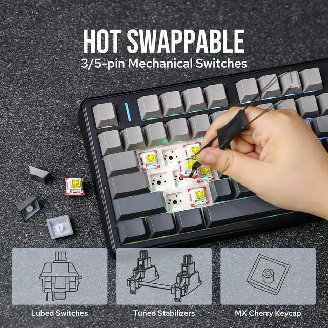Hot Swappable&Flex-Cut PCB and PC Plate: The Flex-Cut 1.2 mm hot-swappable PCB and PC plate allow for a slightly flexible but stable typing experience. Each keystroke is buffered and accurate. The F99 PRO keyboard is compatible with 3-pin or 5-pin switches, and the hot-swappable PCB allows for easy switch replacement without soldering, allowing users to customize their typing experience with their preferred switches. Equipped with pre-lubricated and finely-tuned stabilizers and LEOBOG switches, it offers a smooth typing feel and a pleasing creamy mechanical sound