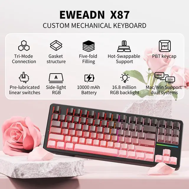 TRI-MODE CONNECTION: The EWEADN X87 wireless mechanical keyboard offers BT 5.0, 2.4GH z, and USB wired connections. Press and hold the FN + Q/W/E/R key combinations to switch between BT1/BT2/BT3/ 2.4G modes. It can connect up to five devices and adapt to specific needs. The shortcut button switches between Windows and Mac systems. X87 is compatible with PCs, laptops, tablets, mobile phones, PS, XBOX, etc..