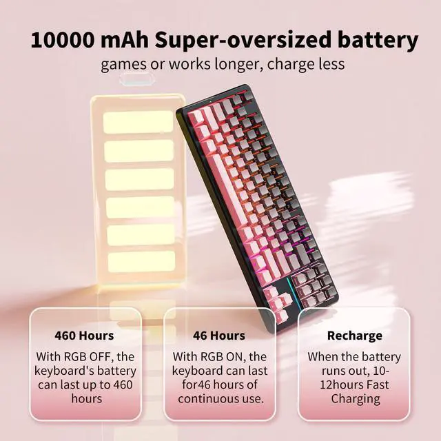 000MAH LARGE-CAPACITY BATTERY: The X87 is equipped with a 5, 000mAh super-large-capacity battery that lasts up to 40-46 hours with RGB on and up to 460 h with RGB off. This generous battery capacity ensures that the keyboard is always ready for long work sessions or intensely gamed marathons.