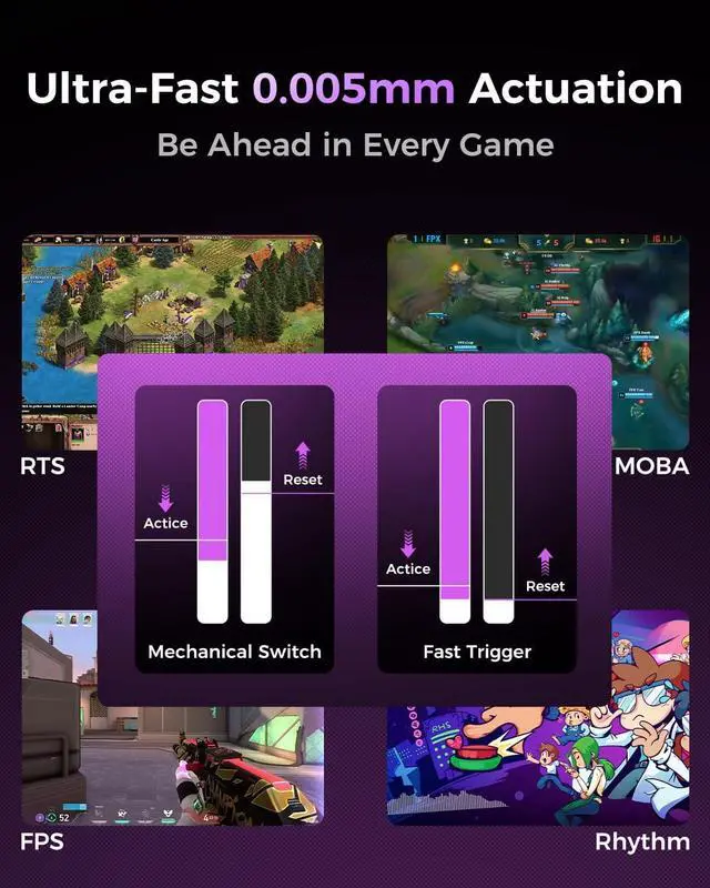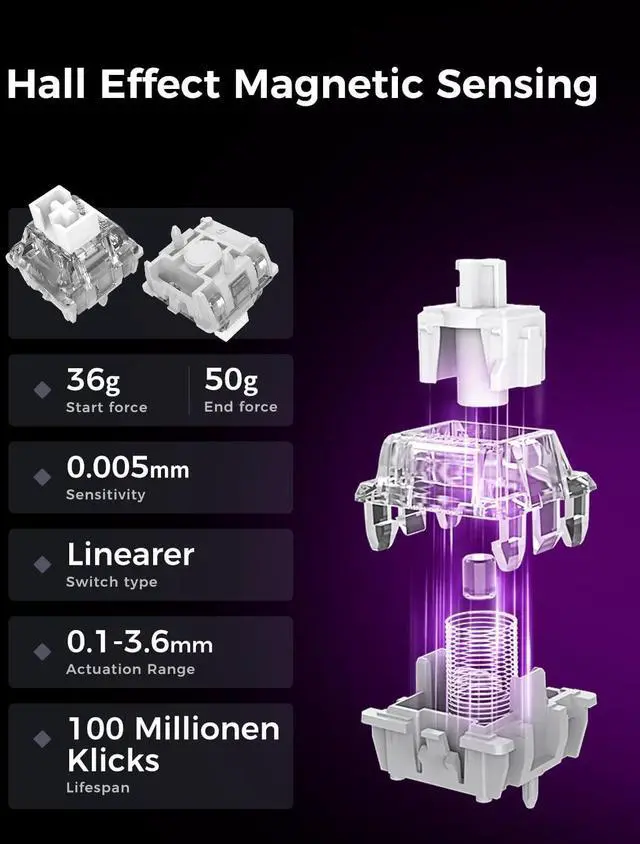 Hall Effect Magnetic Switches for Precision Control -- Advanced Hall Effect technology provides lightning-fast 0.005 mm sensitivity and adjustable actuation points ( 0.13. 6mm), giving you full control over every keystroke.