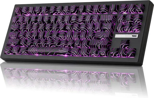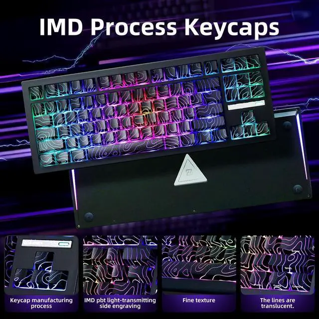 IMD PBT Keycaps with Clear LegendsCrafted from high-purity PBT with IMD technology, the keycaps resist shine and wear while featuring a stunning black topographic theme that glows with RGB. Side-printed, molded legends ensure long-term clarity and smooth light diffusion.