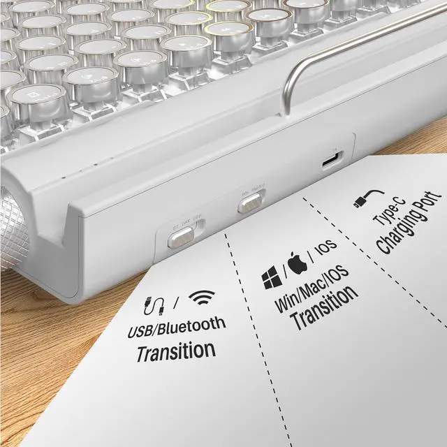 Double-Modes Connectivity: Offering versatile connectivity, the retro mechanical keyboard can be connected via USB-C or Bluetooth to three different devices. allowing you to switch between your tablet, laptop, and phone. Compatible with Windows / macOS / android. This makes it the perfect pick, not just for gamers, but also for professionals who require seamless connectivity with multiple devices