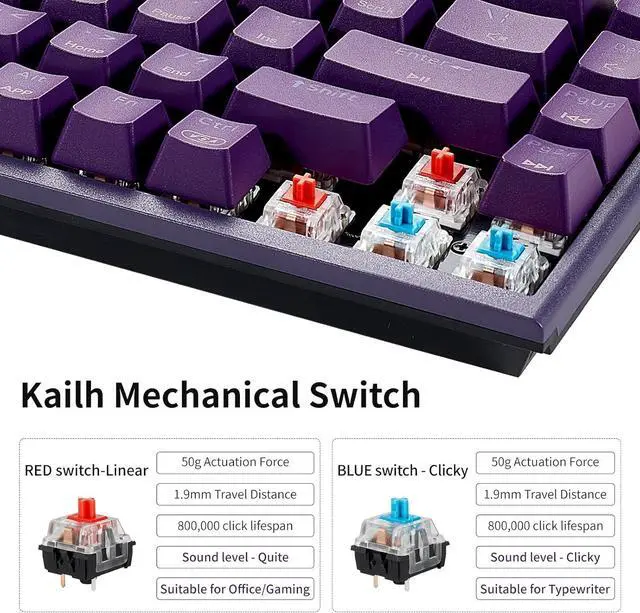 Kailh Mechanical Switch - Blue Switch Mechanical Keyboard provides a distinct tactile feedback and audible click sound with every keypress, offering a satisfying and precise typing confirmation. All keys are conflict-free, allowing you to register inputs rapidly and accurately. This combination delivers both high responsiveness for gaming and exceptional accuracy for typing-intensive tasks.