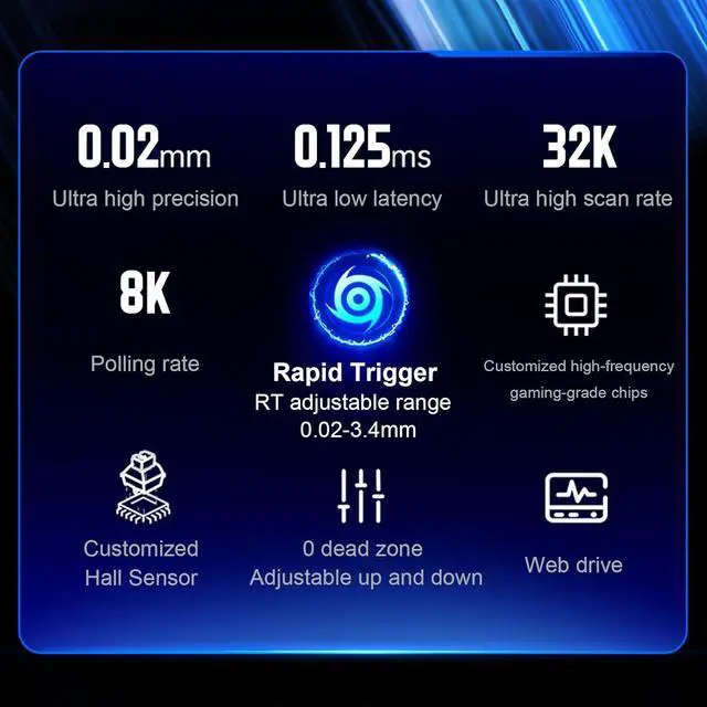 Adjustable Magnetic-Mechanical Switches: The entire keyboard is equipped with fully adjustable high performance magnetic switches, enabling you to set every keys actuation point from a light 0.02 mm to a strong 3.4 mm in 0.02 mm steps, putting you in control for fast keypresses or ultra-accurate typing.