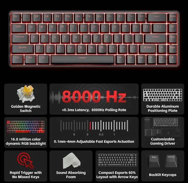 • Lightning-Fast Rapid Trigger: Magnetic switches with 0.1-4.0mm adjustable actuation deliver 300% faster input than traditional keyboards. Experience ultra-responsive gameplay with under 0.3ms latency.